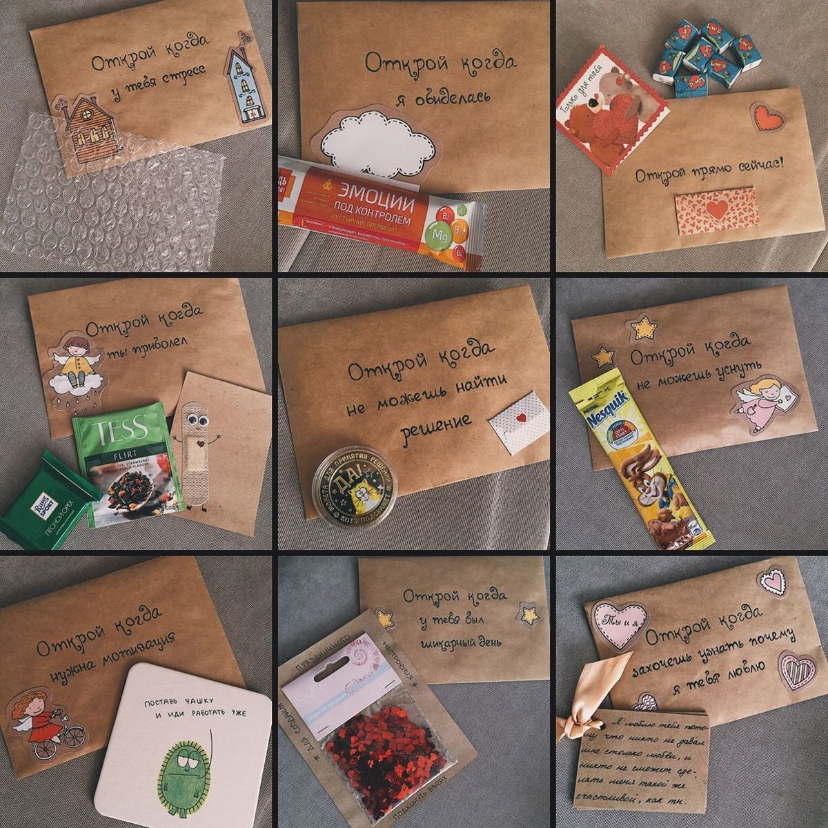 1. Простой и бюджетный вариант подарка - "Открой когда". Суть в том, что есть конверты, их нужно открывать, когда происходит определенное действие. Наполнитель конверта и надпись могут быть любыми в зависимости от твоей фантазии.