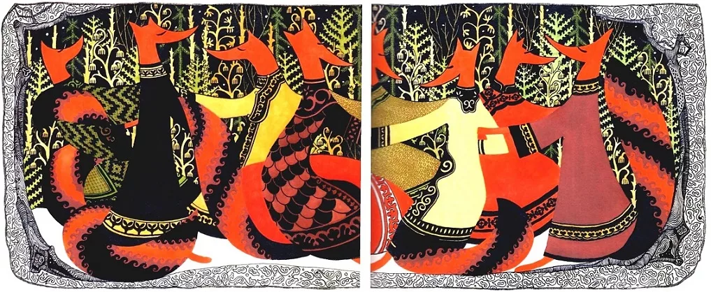 Прибежали к нашей лисе Эльге ещё семь лисиц: сёстры Айогá и Хабалá, подруга Эльги Аинкá, подруги Исамá и Адигá, двоюродные сёстры Ингá и Ангá.