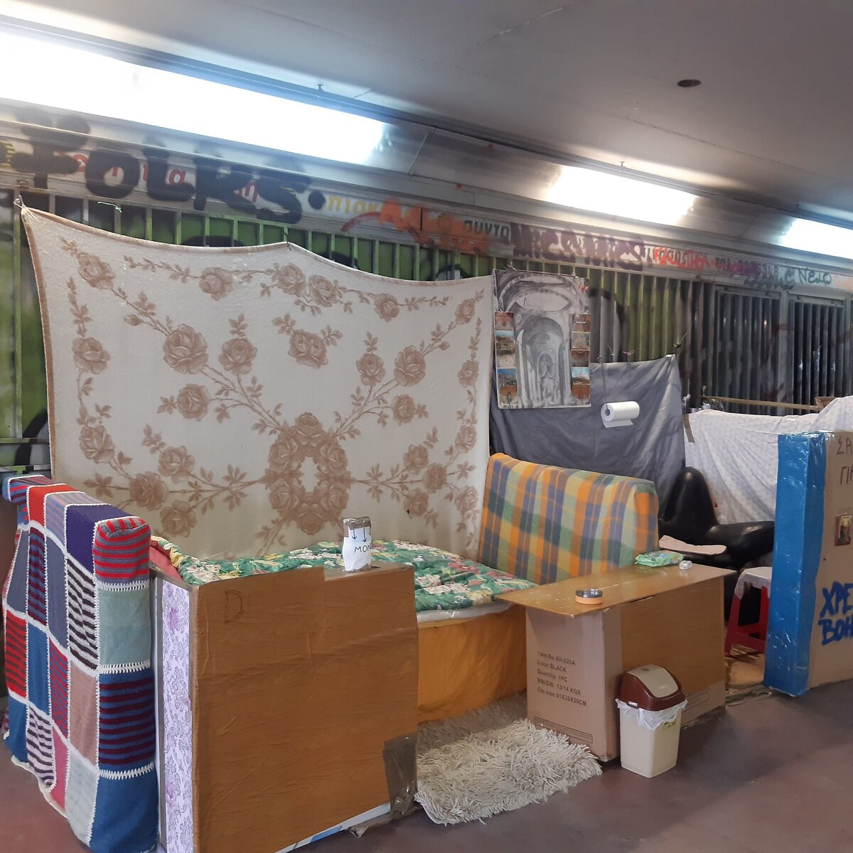 Под трассой Сингру, в пешеходном переходе между двумя афинскими районами Каллифея и Неа Смирни некий бомж устроил себе двухкомнатную квартиру. Он явно пытается привлечь к себе внимание. Хозяина на месте не оказалось, он ушел по делам.