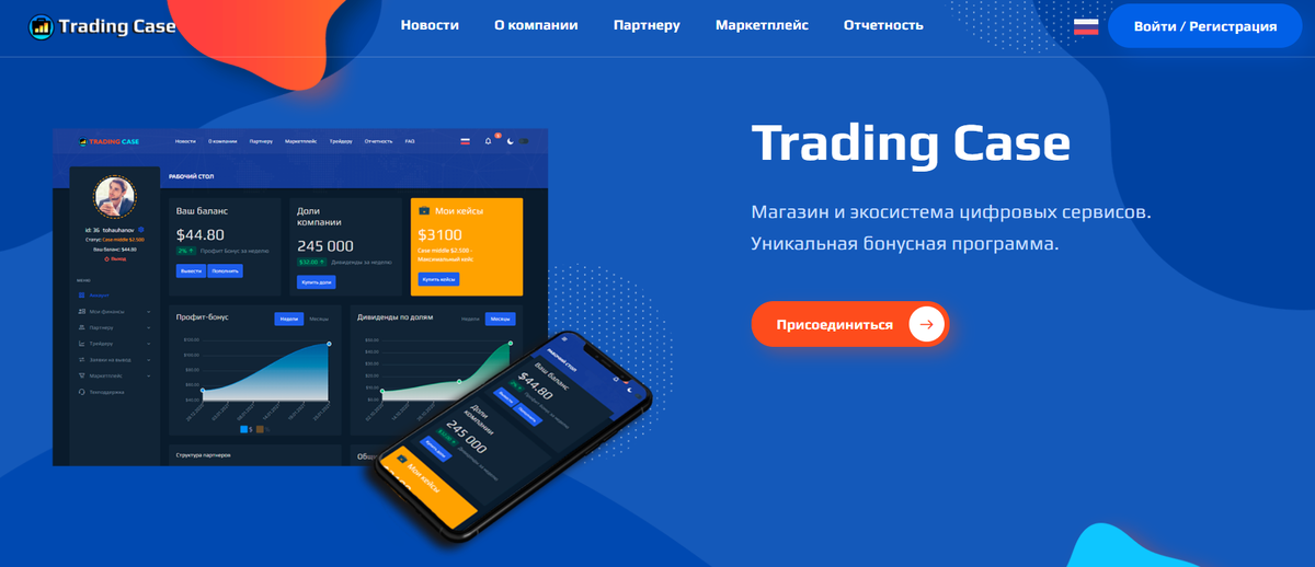 Компания Trading Case - это бизнес-платформа с IT - продуктами и сервисами. Помимо торговли на фондовом рынке, криптовалютой, крипто-активами (торговля осуществляется собственными трейдерами с возможностью привлечения в компанию сторонних трейдеров, для увеличения оборота компании), у них уже запустился свой интернет-магазин «Маркетплейс» - магазин цифровых товаров и сервисов.