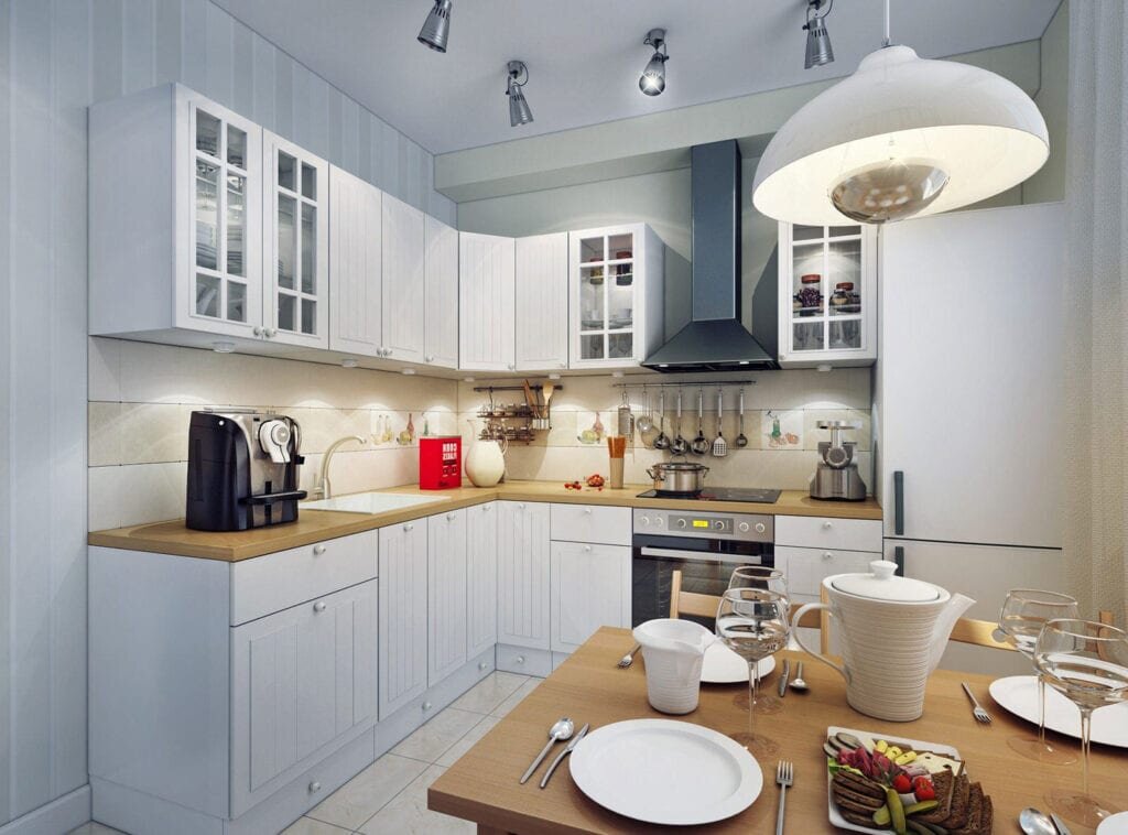 Но в этом случае все связано с естественным освещением. При наличии на кухне достаточно большого окна, дающего в светлое время суток достаточное количества света, можно ограничиться исключительно верхним типом освещения. При недостатке природного света можно воспользоваться верхним освещением с несколькими осветительными приборами, смонтированными в разных местах комнаты. Все будет зависеть от планировки.
