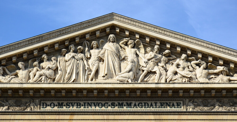 Узкие стороны античных храмов всегда оканчивались вверху невысоким фронтоном, треугольное поле или тимпан которого бывало украшено скульптурными фигурами, а боковые
