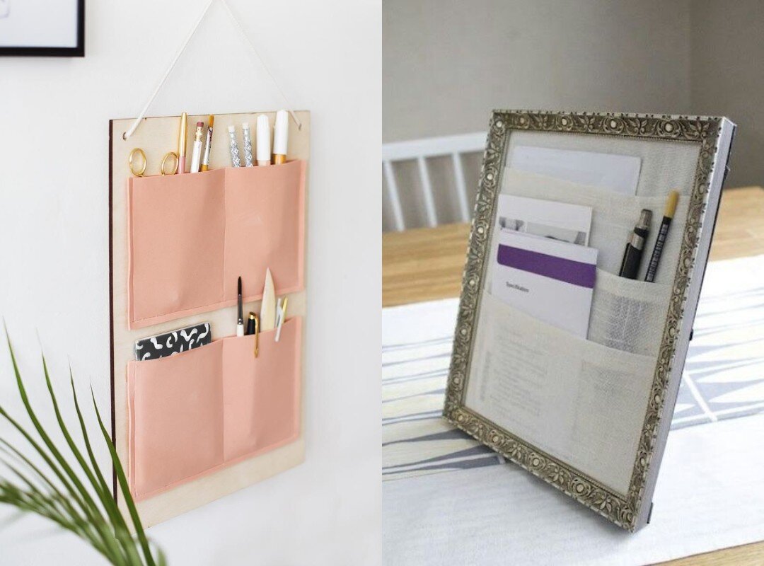 Из обычной рамки для фотографии или картинки может получиться вот такая удобная штуковина. Схема расположения элементов-кармашков может быть индивидуальной и опираться непосредственно на потребности ее создателя.