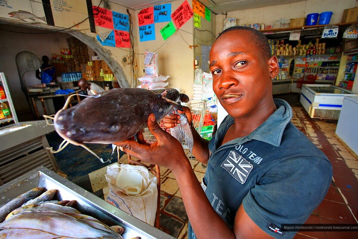 И перекур пытается показать товар лицом. Рыба оказалась с ночного улова. Без скидок, потому что рыба - красивая. (Да, так продают в Африке рыбу, показывая товар лицом и своим обоянием).