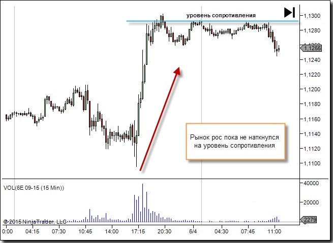Разберем пример. Начинается восходящее движение и упирается в уровень сопротивления. По прошествии времени, когда мы видим, что от этого уровня было уже 3 или даже 4 отскока, мы можем судить, что это место интересно игрокам и на него обращают внимание.