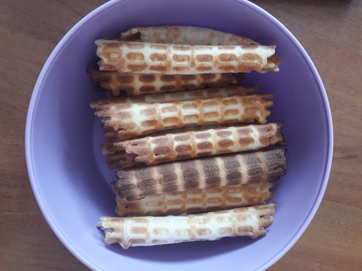 Выпекаем поштучно в вафельнице, а потом сворачиваем в