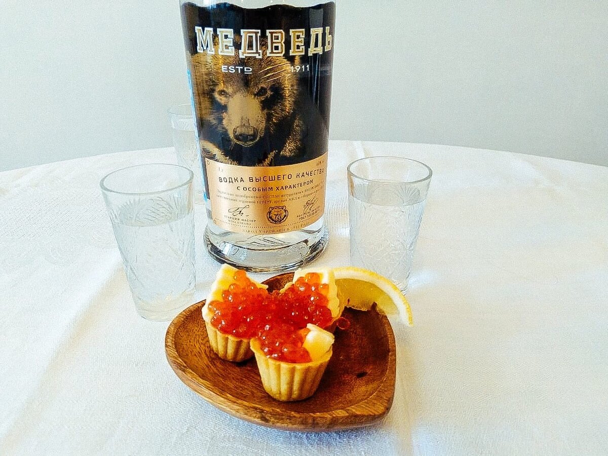 Так у моей сегодняшней помощницы водки “Медведь” есть тонкие сладкие ноты, верный признак настаивания на натуральном меде. Не беда, что у водки нет своего вкуса, зато она универсальный катализатор – помогает ярче проявиться правильным закускам.