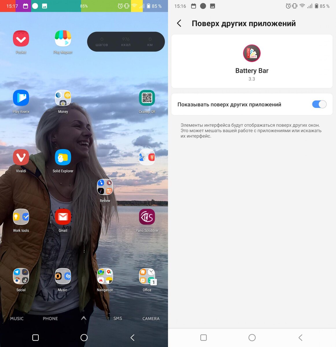 Для работы Battery Bar потребуется разрешить приложению выводить свои данные поверх остальных приложений в настройках. Впрочем, программа сама подскажет, как это сделать.