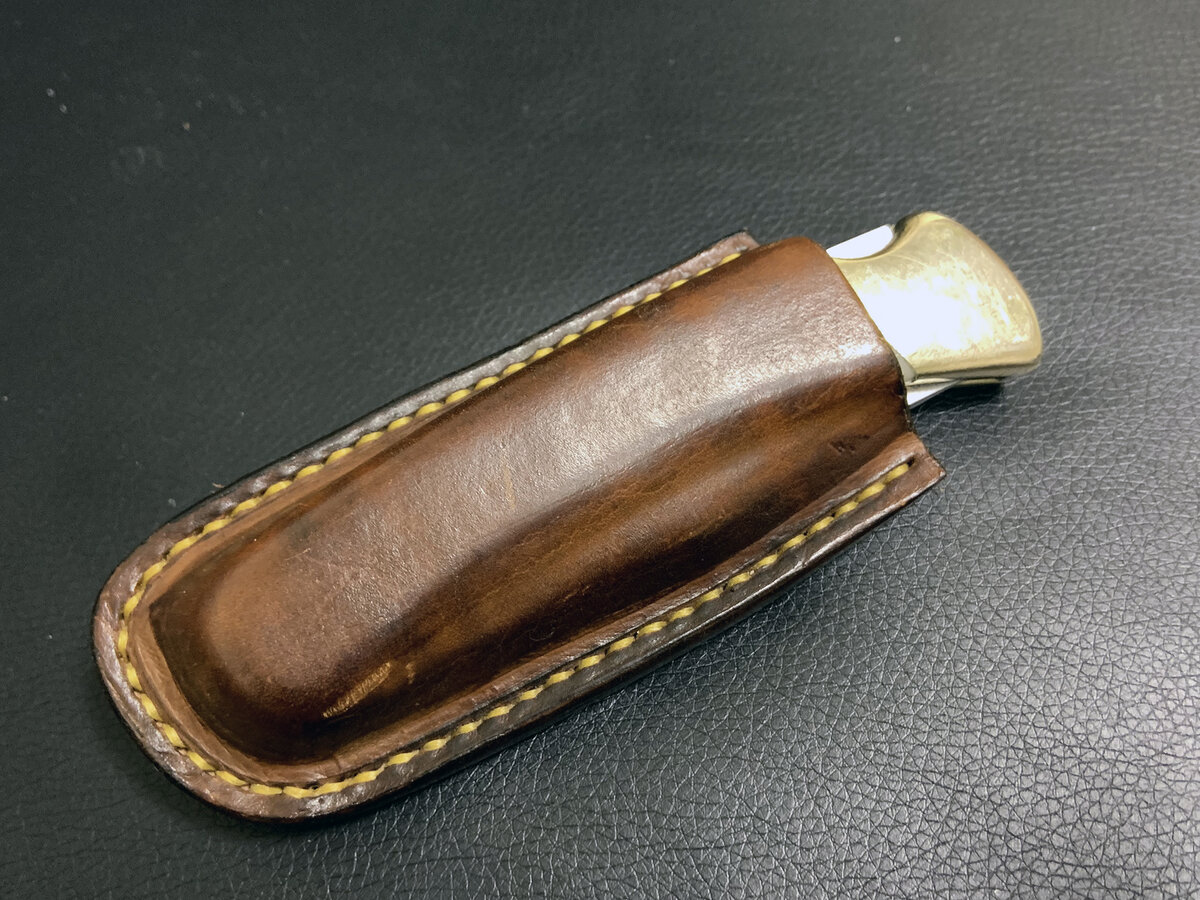 Недавно переделал накладки на Buck 110. Подумал что надо и ножны забубенить. Вот что получилось. Кожа около 3 миллиметров. Растительного дубления. Сформировал верх.