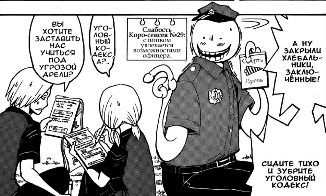 Теперь про мангу. Мне очень нравятся многие персонажи, первое место занимает Коро-сенсей. Есть очень трогательный момент объясняющий его слабости. Нравится его метод обучения, и его диалог с председателем, как стоит проводить обучение. Ещё мне нравится метод обучения английскому языку, учителя английского языка. И отдельные интересные моменты манги, вроде приёма из суммо «Некодомаси(Nekodamashi)».