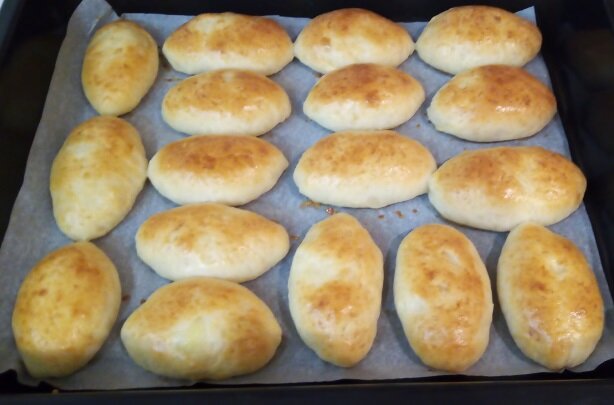 Из всего теста у меня получилось пирожков на один противень.