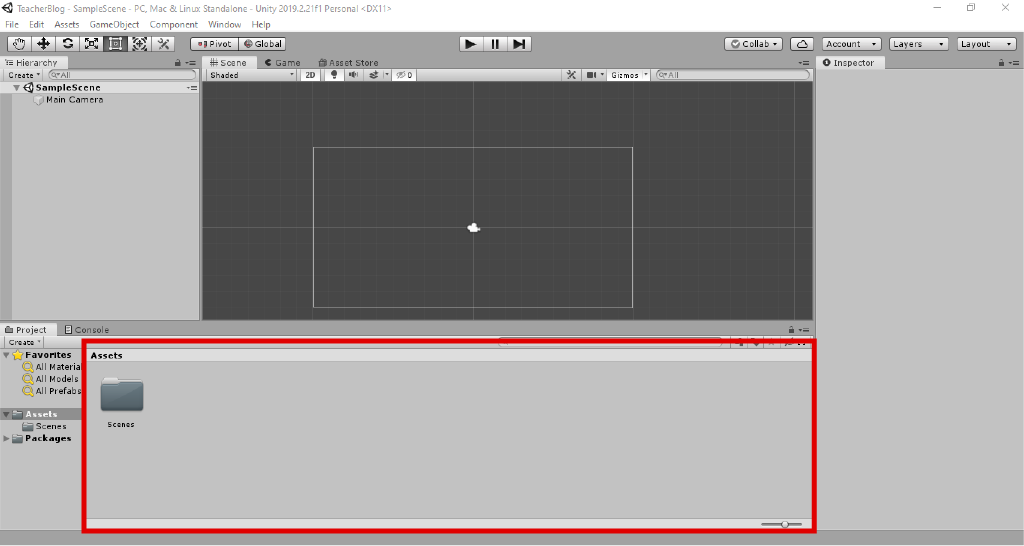 - Это окошко называется assets. Тут будут содержаться все ваши объекты, которые вы будете добавлять в unity. Например какие-то спрайты, музыка и т.д