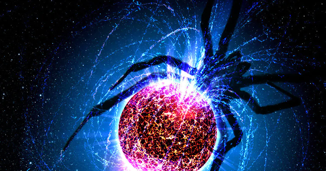 Пульсары, совершающие оборот каждые 30 миллисекунд или меньше, часто называют “звездами-пауками”, поскольку они обычно находятся в двойных системах, где близко вращающаяся звезда-компаньон активно разрушается пульсаром, аккрецирующим материю от своего компаньона.