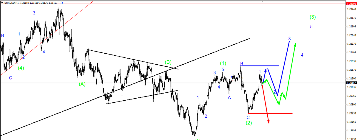 По евро на эту неделю виже 3 варианта развития событий. Первый вариант - пара сначала дойдет до локального максимума, затем начнет формировать 2 волну, после которой последует 3 волна. Возможно, при таком раскладе 3 волна начнет формироваться только через неделю после следующей недели. Второй вариант - 2 волна уже формируется, и в середине недели уже начнется вторая волна. Самый главный критерий сохранения этих сценариев - движение 2 волны должно быть коррекционным. Иначе вступит в силу 3 вариант - пара пробьет начало предполагаемой 1 синей волны, тогда разметку нужно будет менять на продолжение коррекции к 1 зеленой волне.