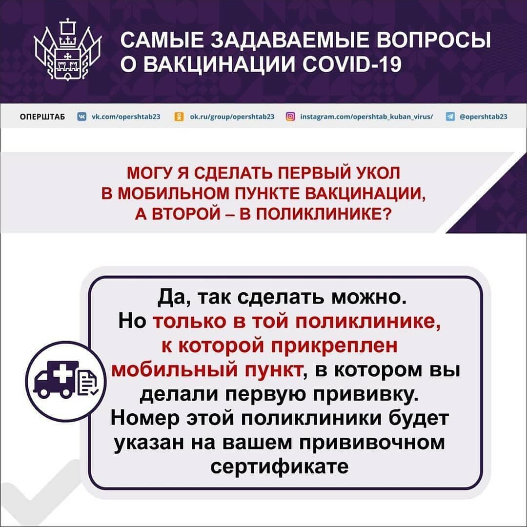 Можно ли сделать первую прививку от коронавируса в мобильном пункте, а вторую – в поликлинике? Что нужно взять с собой на вакцинацию? Можно ли выбрать вакцину? Нужно ли носить маску после прививки? Нужна ли самоизоляция до и после прививки? Подготовили ответы на самые популярные вопросы о вакцинации от COVID-19. @opershtab_kuban_virus