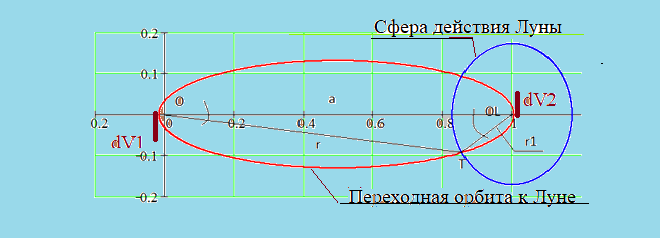 Скорость Va =0.188 км/с на высоте 200 км от Луны не соответствует действительности. В проведенном расчете не учтено, что на расстоянии 66000 км от Луны КА переходит в сферу действия Луны, Луна ускоряет его дальнейший полет . Более точное решение задачи можно получить по модели сфер действия . Орбита перелета НОО -ОЛО разбивается на две ветви, каждая в своей сфере действия, которые стыкуются на границе сфер действия с пересчетом орбитальных параметров. В этом случае скорость КА относительно Луны в точке максимального их сближения равна Va=2,249 км/с, а требуемое приращение скорости dV 2 =2.249 - 1.589=0.660 км/с.