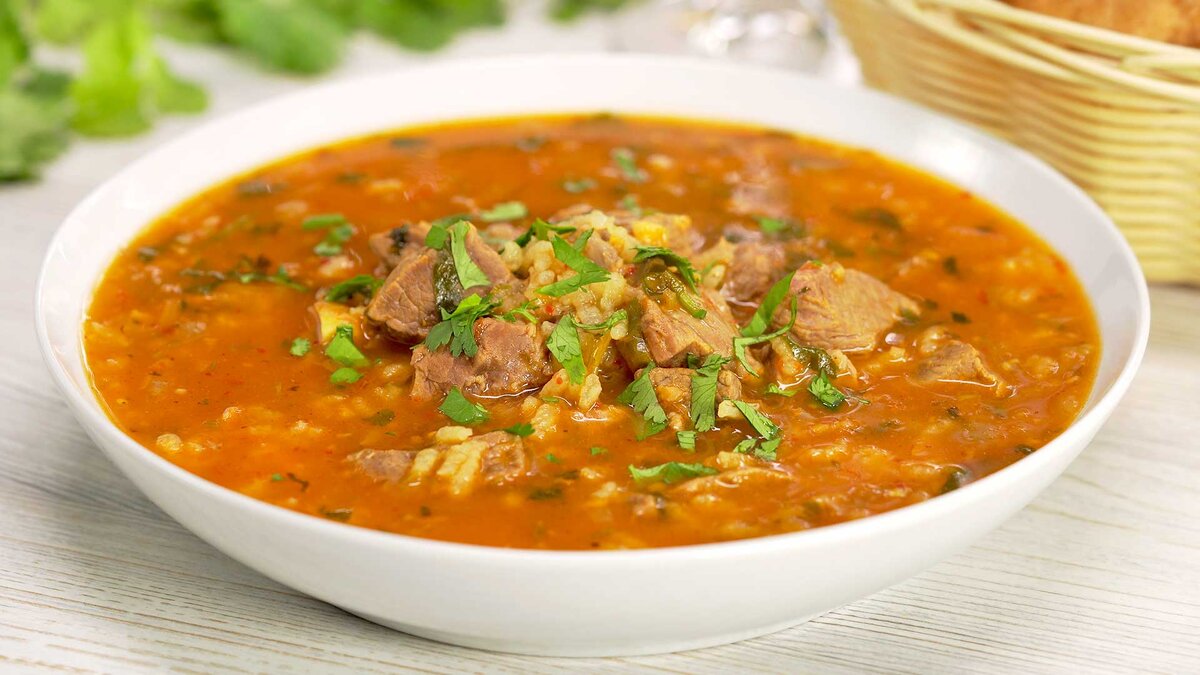 Курицу промойте и порежьте на порционные кусочки.Залейте курицу 2,5 л кипящей водой и варите до готовности (30-40 минут) на среднем огне под крышкой.Промойте рис.Выложите в бульон промытый рис. Когда он начнет набухать (через 10-15 минут), посолите суп.Очистите, вымойте и мелко порежьте лук и морковь.Чеснок очистите от кожицы, мелко порежьте.В сковороде разогрейте сливочное масло.Обжарьте овощи на среднем огне, помешивая 2-3 минуты.Перед окончанием жарки добавьте томатную пасту.И хорошо перемешайте.Чеснок переложите в сковороду к овощам. Тушите овощи вместе около 5–7 минут на самом маленьком огне, помешивая.Переложите овощи в суп.Отдельно приготовьте заправку для супа харчо. Очистите и порежьте чеснок, затем немного подавите его. Вымойте и нарежьте зелень.Чеснок смешайте с мелко порубленной зеленью укропа и базилика.Наш суп харчо готов. При подаче посыпать заправкой.