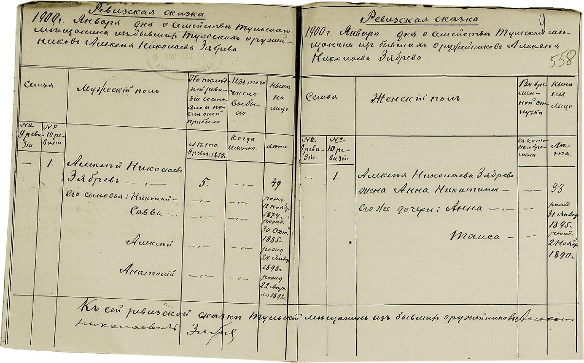 Ревизские сказки - перепись податного населения России. В них указывались имена, возраст, родственные связи. Безусловно это очень полезный документ для восстановления семейной истории. Жаль только, что последняя ревизия была в далёком 1858 году. Однако регулярно в архиве мне попадаются отдельные ревизские сказки и после 1858 года. Вот, например, семья тульского мещанина из бывших оружейников Алексея Николаевича Зябрева в 1900 году. Как и положено в документе данного типа, указан возраст по предыдущей ревизии (в 1850 г.) Слева мужчины, справа женщины. У всех, кто родился после 1850 года, записана точно дата рождения. С возрастом только что-то не то. Алексею было 5 лет в 1850 году, а в 1900 вдруг стало 49. Но это не важно. Посемейные списки нужны не для определения точного возраста (для этого есть метрические книги), они помогают нам узнать полный состав семьи на определённый год. А это всегда очень интересно. ✉∿∿∿∿∿∿∿∿∿∿∿∿∿∿∿∿∿✉ Если есть желание узнать о своих предках, напишите мне: po