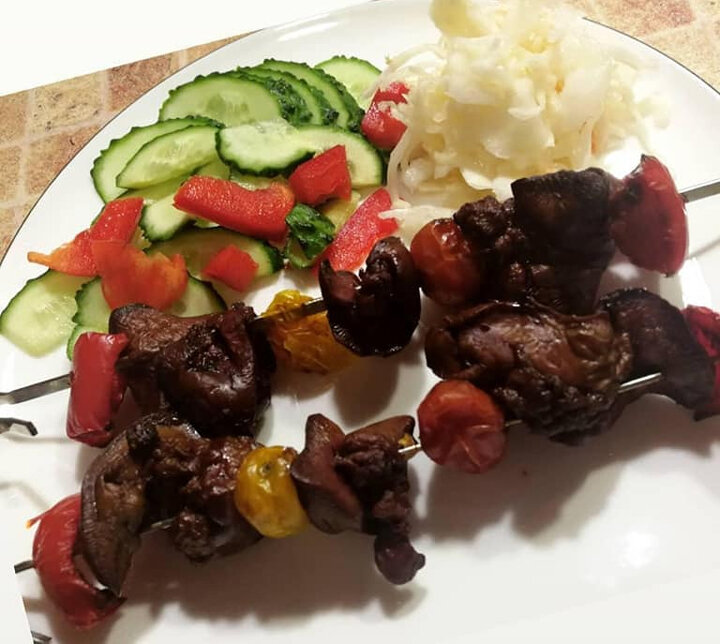 Ужин: шашлычок из куриной печени с овощами и квашеной капустой.