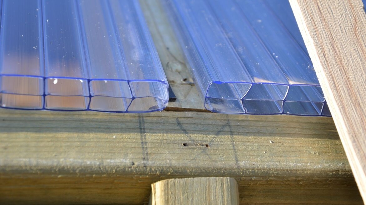 Шаг 1. Листы поликарбоната раскраивают таким образом, чтобы между ними и деревянной рамой был зазор 2 мм с каждой стороны.