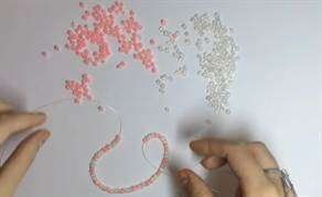Для начала набираем бисер на длину браслета. Для примера, берем по две розовые и две белые бисеринки, но вы сможете избрать цвета по вашему усмотрению. Нанизываем бисер до того времени, пока не наберем нужную длину браслета.