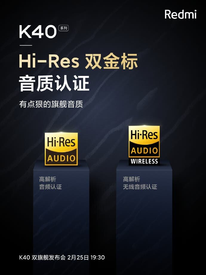 В течение последних нескольких дней Redmi дразнила характерные особенности предстоящей серии Redmi k40. В недавнем тизере компания заявила, что это устройство поддерживает Dolby Atmos который может устранить перекрестные помехи и имитировать эффекты пространственного объемного звука. Последний тизер этого устройства показывает, что оно имеет новый сертификат беспроводного аудио высокого разрешения высокого разрешения. Официально двойные флагманы Redmi K40 будут иметь более высокое разрешение звука, больший динамический диапазон и большую частотную характеристику.