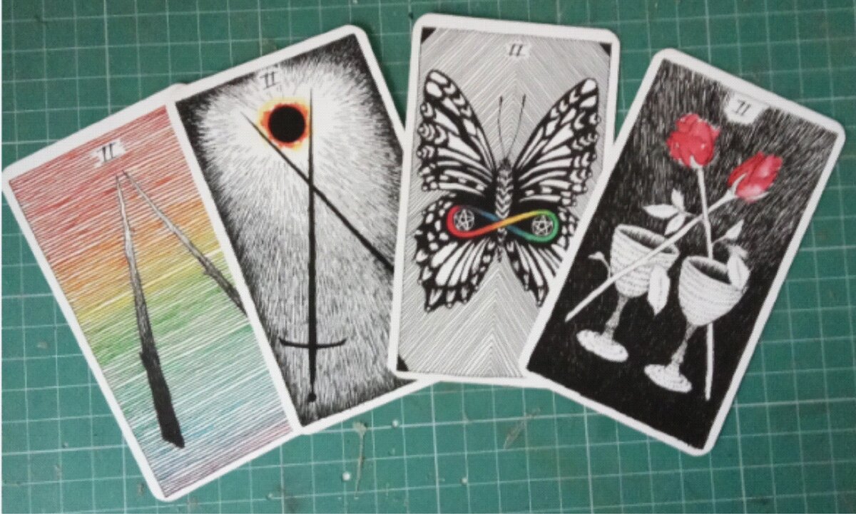 Остальные двойки беззаботны, ну, может быть двойка посохов страдает сомнениями и все же это сомнения от изобилия, всё есть, чего же желать ещё? Это спортивная проблематика, мы здесь вдвоём а кто лучше? Двойка кубков это отношения между двумя, а двойка пентаклей это удача вдруг упавшая из ниоткуда.