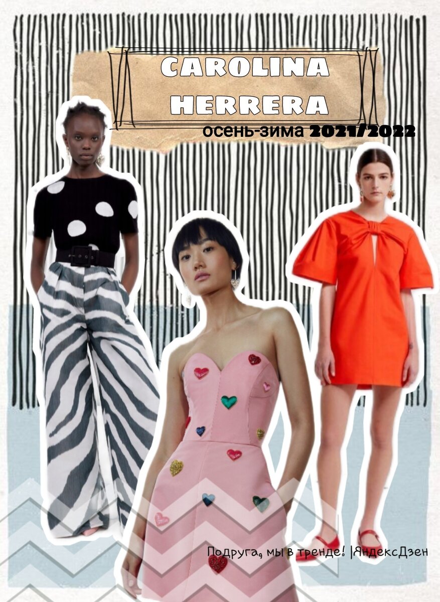 Приветствую друзья! Вы попали на канал Подруга, мы в тренде! Все самое модное, актуальное и интересное! Коллекция CH осень-зима 2021/2022 получилась достаточно интересной за счет принтов и лаконичных цветов. Давайте посмотрим на примере представленных луков: 1. Горох. Горошик. Разного размера, цвета. В том числе в сочетании с другим принтом, активно использующимся в этой коллекции: А также цветной вариант: Примечательно, что в летней коллекции 2020 года также был горох: Так и в коллекции лета 2021 Сarolina Нerrera: 2. Теперь цвет. Их несколько: Оранжевый, коралловый (оттенки): Зеленый, цвет увядающей травы, приближение во втором случае к хаки: И голубой: Интересный цветовой код. Мне напомнил раннюю осень. Цвет листвы, травы и еще чистого летнего неба. 3. Вернемся к принту. Полоска геометрия и полоска анималистическая - под зебру. 4. Еще один животный принт - под жирафа. 5. В отношении силуэта - прослеживается тенденция к обозначению линии талии, а также А-силуэт. 6. Активное использов