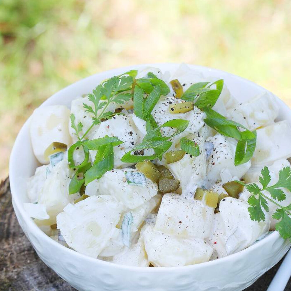 Вылить соус в миску с остывшим картофелем. Перемешайте картофельный салат и проверьте его вкус. При необходимости добавьте еще соли или перца. Украсить салат измельченным чесноком, укропом или петрушкой. Подавать при комнатной температуре или слегка охлажденным.