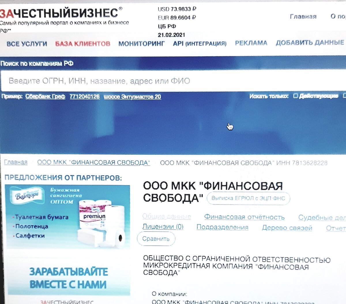 Две недели назад еду с ребёнком в автомобиле и вдруг звонок - на противоположной стороне нетрезвый мужской голос: "Мы про тебя всё знаем, твоя фамилия такая-то, живёшь там-то, позвони сыну.., или твоя семья хлебнёт горя... и т.д... с оскорблениями и угрозами".. Пытаюсь выяснить кто это и причину обращения )).. Назвался каким-то Олегом Москвичёвым-Москвиным.. без дополнительной информации.. Всё остальное узнал уже, позвонив сыну на Север.. Оказалось, что его мать, с которой мы давно в разводе, (а у меня другая семья уже много лет), влезла в какие-то интернет-торги в 2017 году и прогорела, потеряв крупную сумму денег. Тут же нашлись каке-то проходимцы, пообещавшие вернуть ей утраченное, но для этого нужны деньги, и немалые.. В общем, она назанимала столько денег, что сыну пришлось объявить её банкротом и продать материнскую квартиру, (свою долю, в которой, я оставил сыну, при разводе), для обеспечения отдачи долгов банкам. Но она не угомонилась и занимать стала, уже, у родственников, знакомых, а когда кредит доверия закончился, то на "помощь" в освобождении от финансов и пришла МКК ООО "Финансовая свобода", с филиалом в г. Северодвинске Архангельской области. На обращение моего сына к руководителю местной "освободительной которы" о том, что мать его в "чёрном списке" финансовых организаций и не нужно далее кредитовать её, во избежание долгов, ответ был простой - у них свои методы выбивания долгов.. В ноябре 2020 года они вновь кредитовали его мать.. Тогда с начала февраля они (МКК) перешли к вымогательству и угрозам мои детям, их жёнам, мне лично, не стесняясь в выражениях и требованиях. Есть аудио материалы, список телефонов, СМС записи, сообщения из соцсети с угрозами, оскорблениями и нецензурной бранью... Я вызвал наряд полиции, написал заявление, приложил материалы.. Прошло две недели, установленные законом на принятие действий.. В общем, мне отказали в возбуждении производства по делу.. Основание - никто не отвечает на звонки по списку, мной прикреплённых номеров.. Ну и, как обычно в таких случаях - никто, кроме нас.. я начал поиск.. Оказалось, что всё проще - интернет в помощь и информация об "освободителях" уже на моём столе.. за два дня.. В интернете я нашёл большое количество комментариев людей, столкнувшихся с такими конторами и попавших под пресс этих вымогателей, на сайте "за честный бизнес" обозначены 76 конкурирующих между собой контор МКК с указанием регистрации их деятельности, количеством сотрудников, налогового учёта, фамилии директоров и учредителей и т.д. и т.п.., но судебных производств у них нет.. Оказывается вымогательство, угрозы, доведение людей до больничной койки, связанных с заёмщиками лишь узами родства, лишь фамилией, лишь прошлым - в чести у данных структур и это их "законы", законы ОПГ - организованной преступной группы по отъёму денег у людей, а служители закона, призванные служить и защищать, забывают о своём долге... Однако я знаю, весь этот беспредел - до поры, до времени.., если люди, попавшие в подобные ситуации, воспользуются своим правом обращений в правоохранительные структуры по установлению личностей и организаторов этого преступного"бизнеса". Долг матери перед МКК ООО "Финансовая свобода" сын закрыл своей заводской зарплатой, в ущерб своей семье, но, для меня лично, это уже не повод остановиться в поисках вымогателей., которые должны ответ