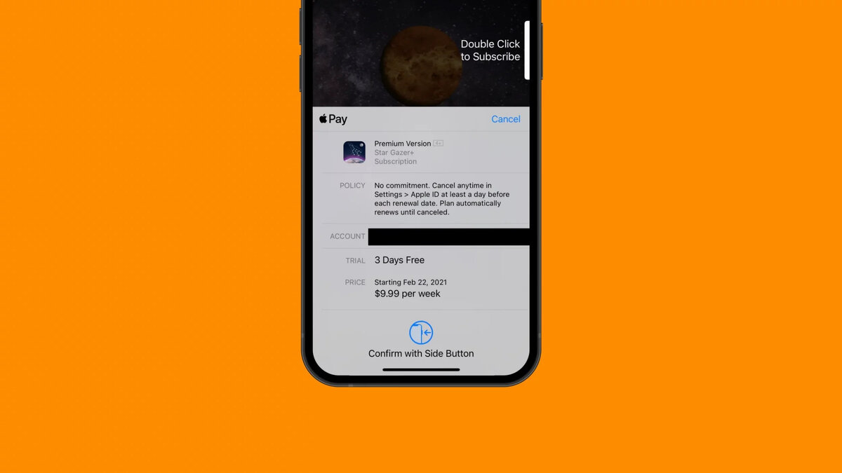 Первым и самым заметным нововведением стала замена значка App Store на логотип Apple Pay, чтобы пользователям было ясно, что они совершают покупку. Apple также увеличила текст о стоимости подписки и сроке действия бесплатного пробного периода, сделав его более разборчивым, заодно обновив определение, чтобы оно был понятнее покупателю («3 дня пробного периода» сменились на «3 дня бесплатного периода», «9,99 долларов/неделя» на «9,99 долларов в неделю» и другие).