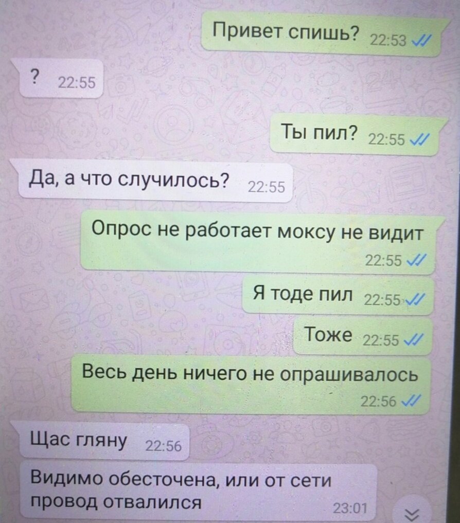 Сразу видно, что переписка между мужчинами :) Кто-нибудь вообще будет в 22:53, в выходной день отвечать на вопрос: "Ты спишь?", тем более по работе? Обычно после такого вопроса ожидается приглашение поработать.