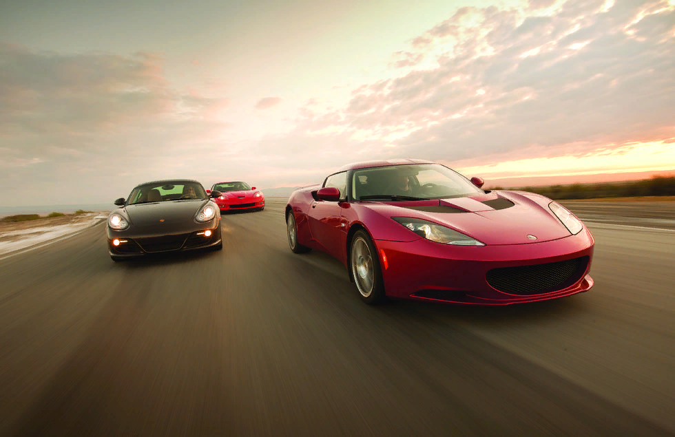 Из архива: сравнение трех различных подходов к одной и той же цели спортивного автомобиля с 2010 годом Chevy Corvette Grand Sport, Lotus Evora и Porsche Cayman S.