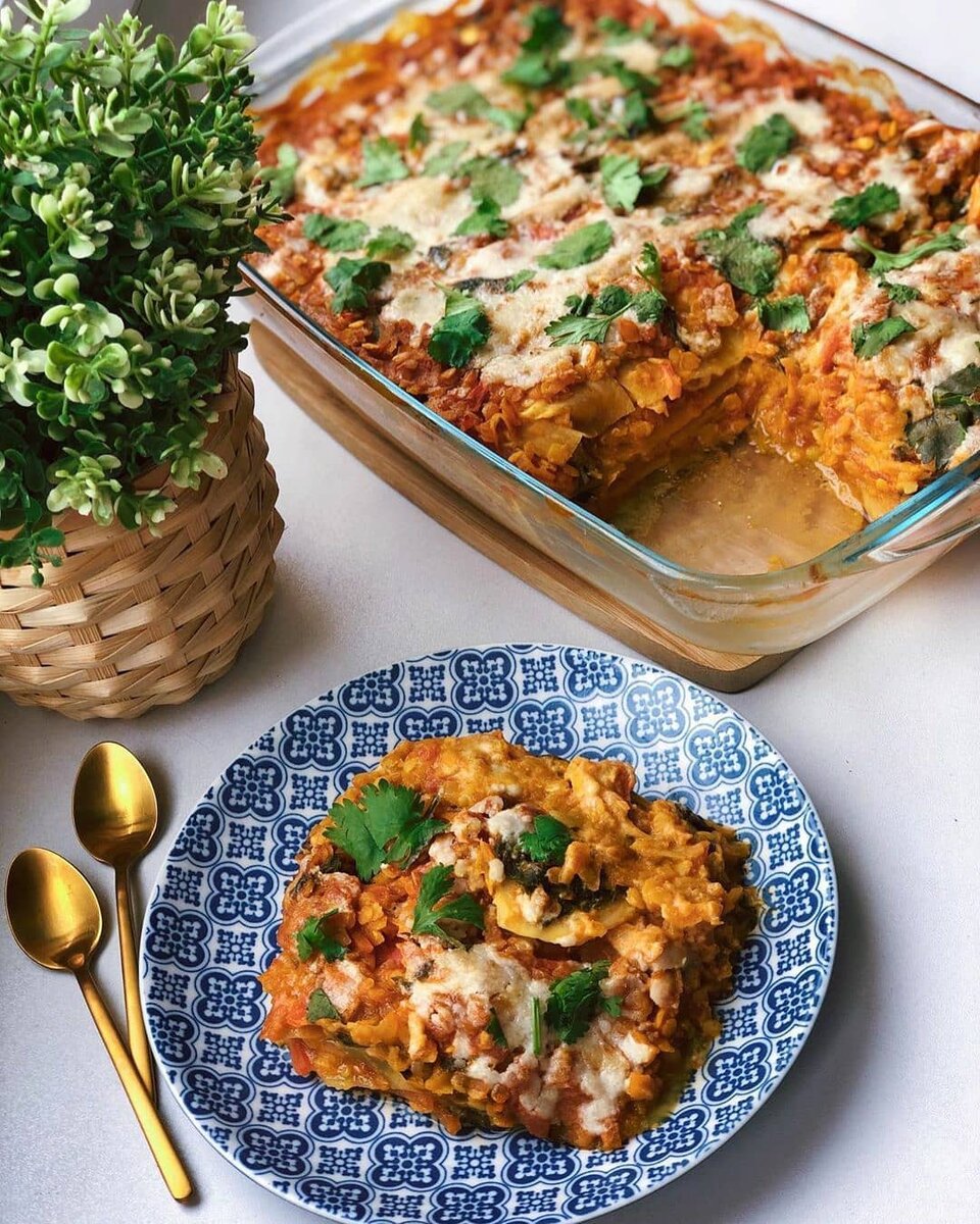 8) Достаём лазанью, поливаем остатками соуса (можно использовать кунжутную пасту для этого соуса) и посыпаем свежей зеленью.