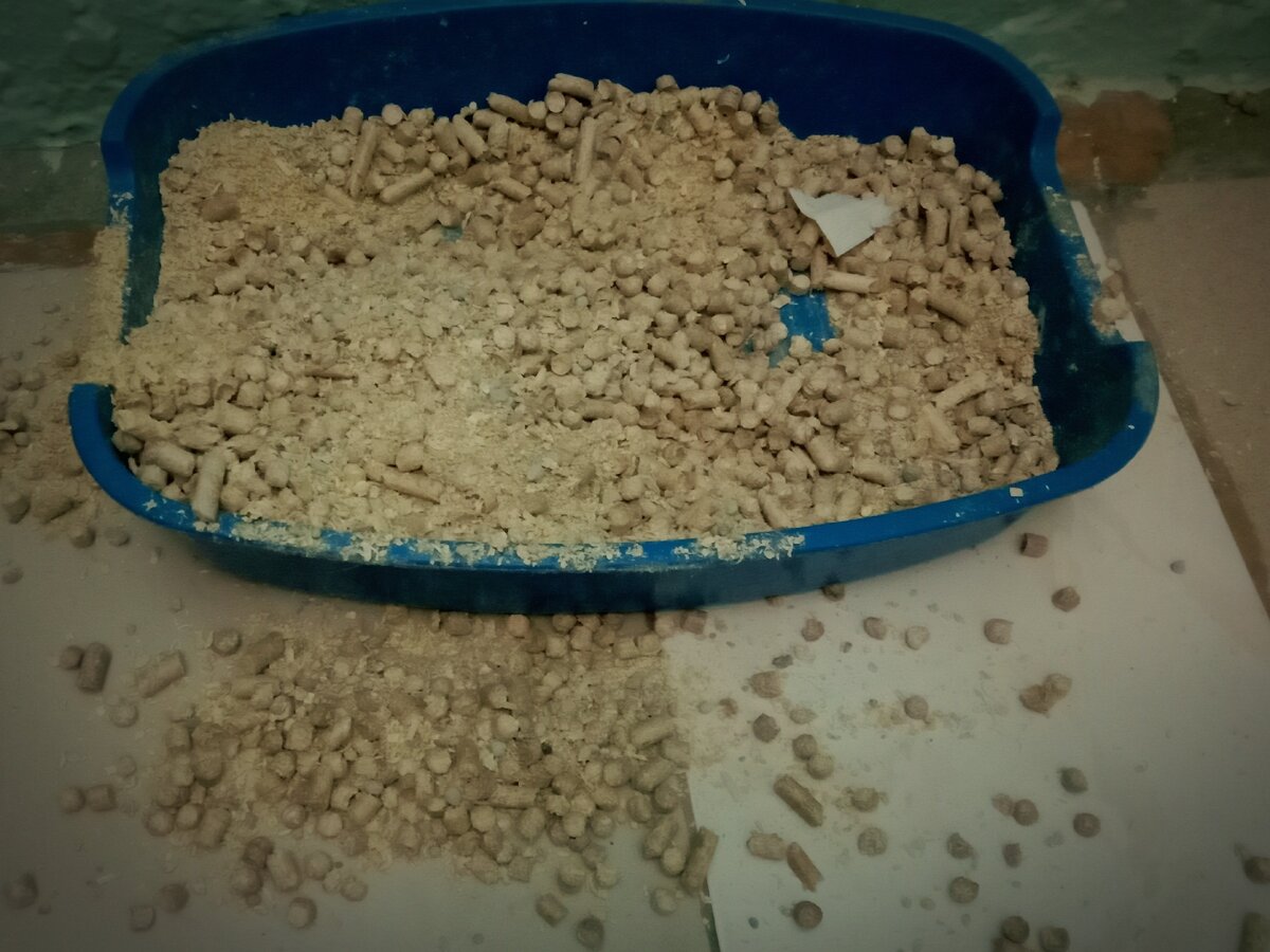 Лоток с древесным наполнителем был предложен кошке после еды.