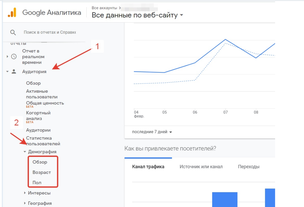 1.Демографические данные (данные по полу и возрасту). С помощью этого отчета можно узнать, какая часть аудитории по демографическим признакам является более целевой для Вашей тематики, и использовать это в рекламных кампаниях. Например, посетители какого пола и возраста лучше конвертируются в заявку. Чтобы посмотреть данный отчет, следуйте скриншотам: