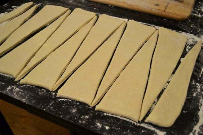 Для быстрого приготовления круассанов я использую покупное тесто. Размораживаем тесто и раскатываем его, нам нужно его разделить на треугольники.