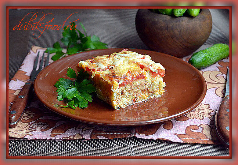 Выложить фарш с луком и томатом, затем опять кабачки.