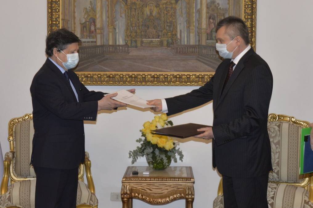 Посол Российской Федерации в Республике Парагвай Александр Писарев вручил копии верительных писем министру иностранных дел Евклиду Асеведо.