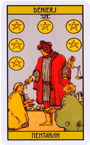 Полное описание колоды на сайте: На аркане состоятельный купец или вельможа. В одной руке у него весы, а другой он отмеряет и раздает милостыню двум нищим. Вот и пройдена героем Пятерка Пентаклей. Он смог признать свое реальное место, свыкся с ним и понял, что на самом деле уже не так и мало достигнуто. Он уже не нищий студент или подмастерье. Он многое может сам, неплохо зарабатывает, имеет имя, вес. Да, до великих еще далеко, но это ничуть не умоляет его личных достижений. Вы еще помните изображение Пятерки Пентаклей? Согласитесь, натерпелся тогда наш мастер. Он прошел этап самоунижения, он топтал свое самолюбие изнутри. Пора это компенсировать. Переход с Пятерки на Шестерку происходит как правило внезапно. Человек резко вдруг понимает, что все на самом деле хорошо, и хватит уже страдать. Пора жить полной жизнью, радоваться своим успехам и перестать смотреть на малодостижимые исторические примеры. Никому не дано стать вторым Александром Македонским, или Рокфеллером, Биллом Гейтсом,