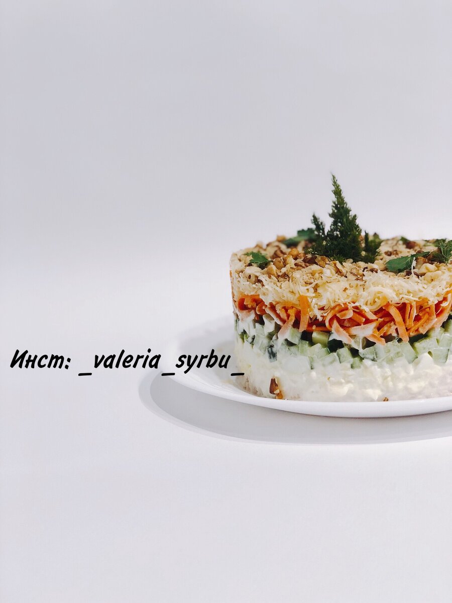 Можно поменять слои и обойтись без сыра (куриная грудка приправленная, майонез, огурец, морковка, майонез, яйца, майонез орехи )