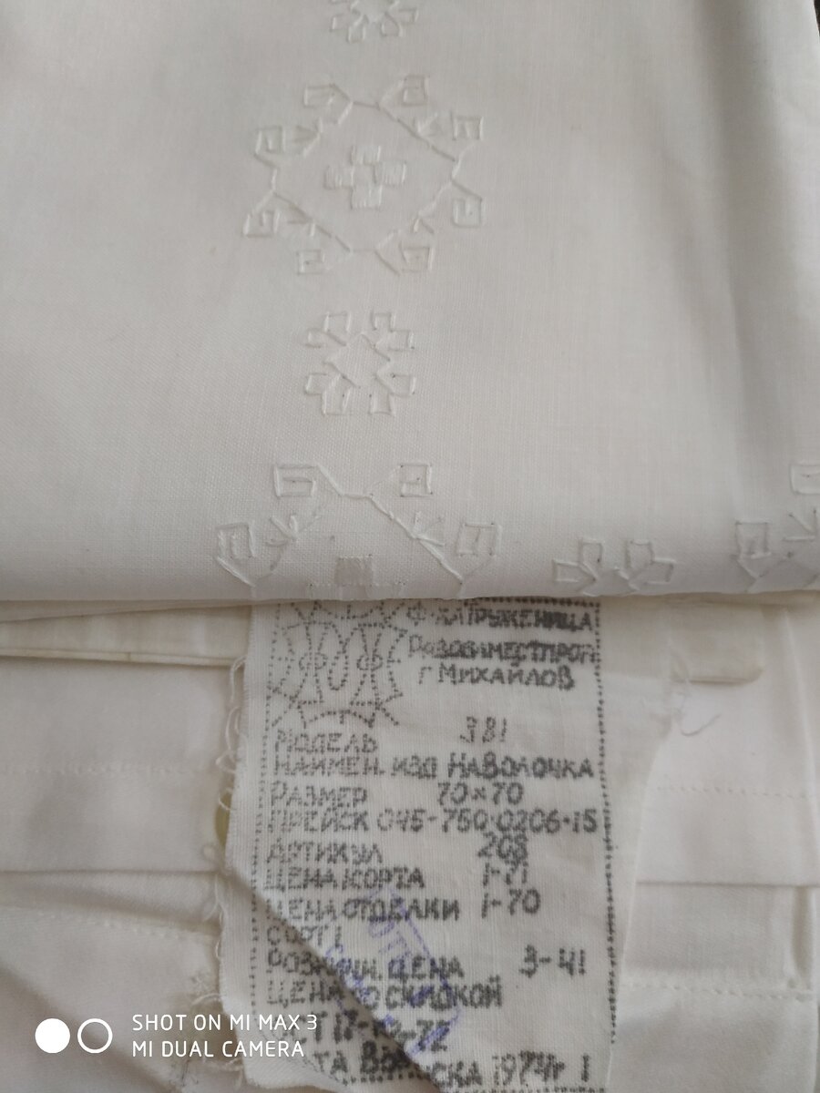 На следующей наволочке ценник частично вшит в изделие,поэтому не смогла разобрать,где всё-таки она изготовлена. Где-то в Тульской области кажется. Наволочка простая,без вышивок,из более тонкого хлопка,с пуговицами,немного изменила цвет. Изготовлена в декабре 1975 года. И это предприятие существует до сих пор по прежнему адресу: Заокский химический завод,п.Заокский,ул. Ленина 81 Тульская область. Такие дела!