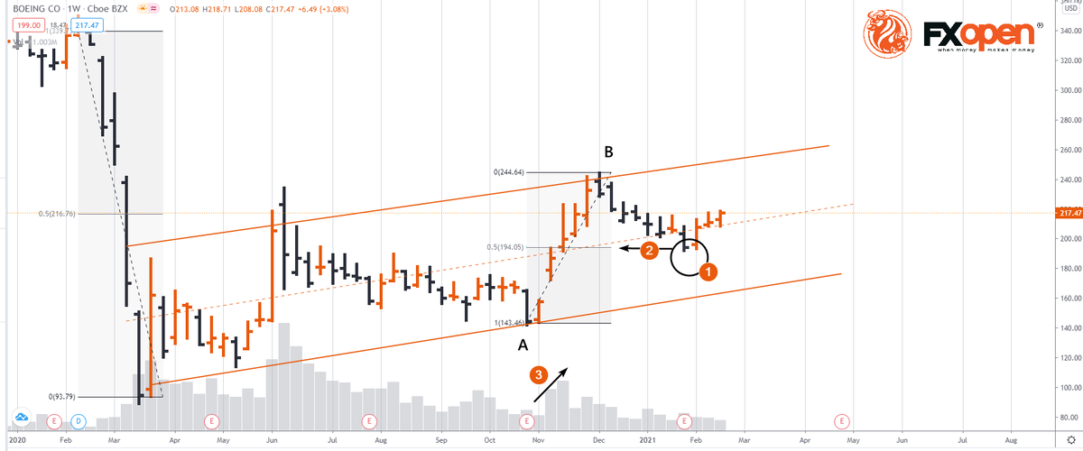 - – Цена формирует 50% откат по уровням Фибоначчи относительно роста от минимума А к вершине В. Это признак восходящего тренда. Что еще примечательно, рост от А к В происходил на увеличивающихся объемах, что можно трактовать как открывающиеся инвестиционные позиции.