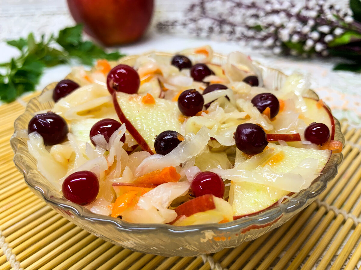 Салат из кислой капусты с добавлением яблока и клюквы – легкое и полезное витаминное блюдо. В зимнее время такая закуска не редкий гость за повседневным и праздничным столом. Дольки свежего яблока придадут салату свежий аромат, а клюква сделает его оригинальным и пикантным на вкус. Приготовить капустный салат можно в любое время и за считанные минуты.