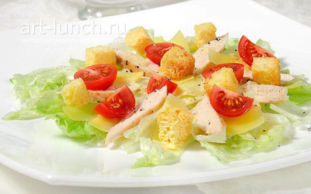 Кладем салат, сверху курицу и пармезан, потом кладем сухарики и поливаем соусом.