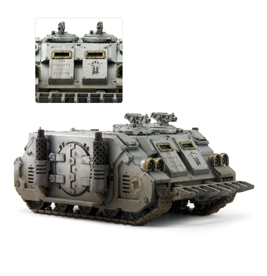 «Рино» - самый распространенный бронетранспортер в Империуме. Его основанная на древней СШК базовая конструкция крепка, надежна и проста в обслуживании. Его адаптивная силовая установка может работать на самом разнообразном топливе (словно делориан из трилогии "Назад в будущее", работавший на банановой кожуре и другом мусоре из ближайшей помойки)