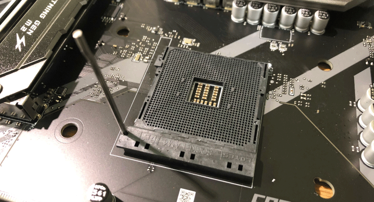 Начните работать с материнской платой снаружи корпуса. Пожалуйста, положите ее на упаковочную коробку, подложив антистатический пакет или пену, и освободите рычаг, удерживающий пластиковую защиту разъема для процессора.