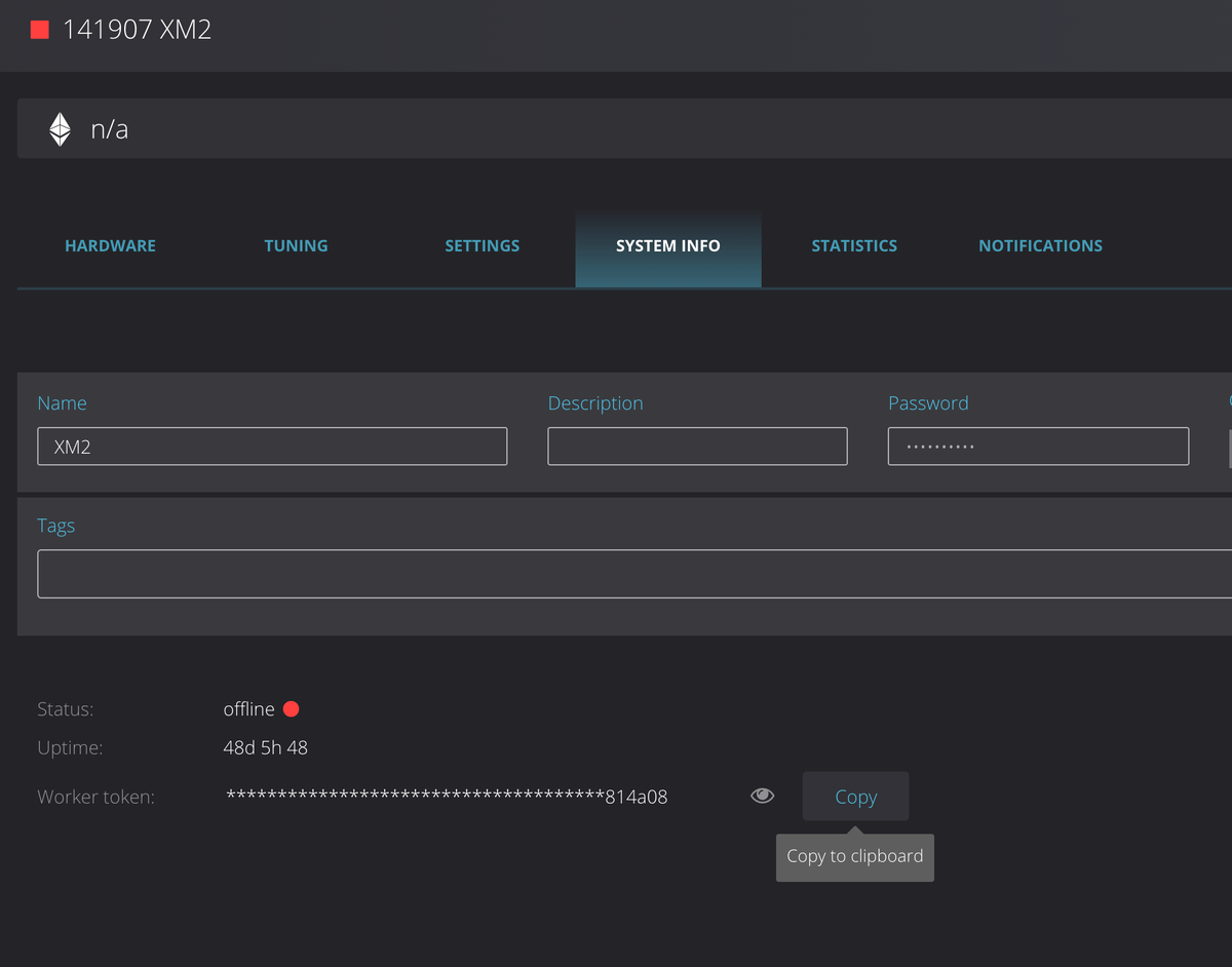 Затем перейдите на вкладку «Информация о системе» и скопируйте токен рабочего. На скриншоте ниже он внизу.