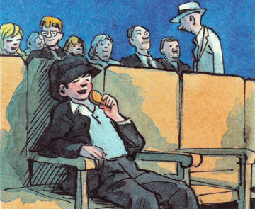 В кино они взяли билеты и купили два мятных пряника. Вдруг зазвонил звонок. Костя бросился занимать место, а Шурик где-то застрял. Вот Костя занял два места. На одно сел сам, а на другое положил замазку.