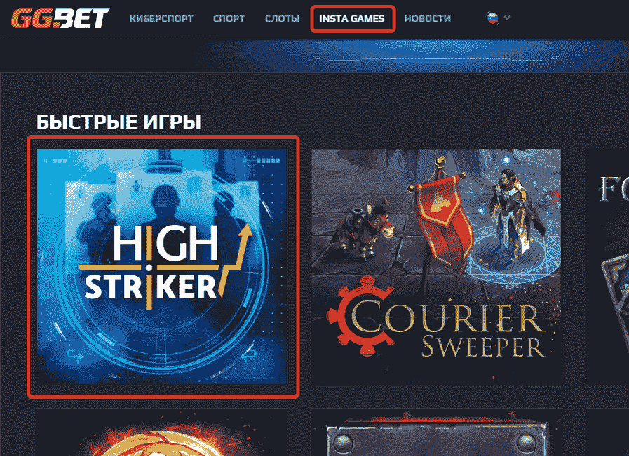 Далее выбираете в верхнем меню “Insta games” – появится список мини-игр, выбираем “HIGH STRIKER”, как показано на скриншоте ниже: